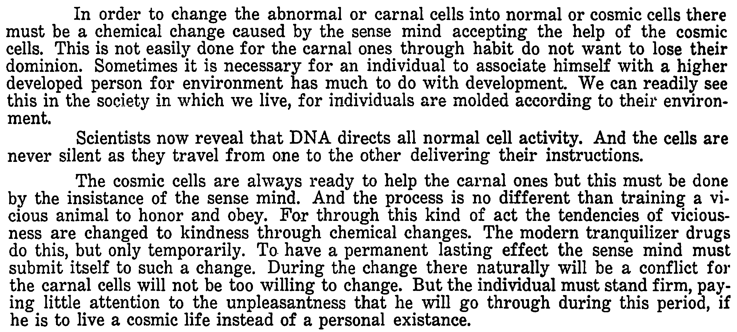 In order to change the abnormal or carnal cells into normal or cosmic cells there must be a chemical change caused by the sense mind accepting the help of the cosmic cells.