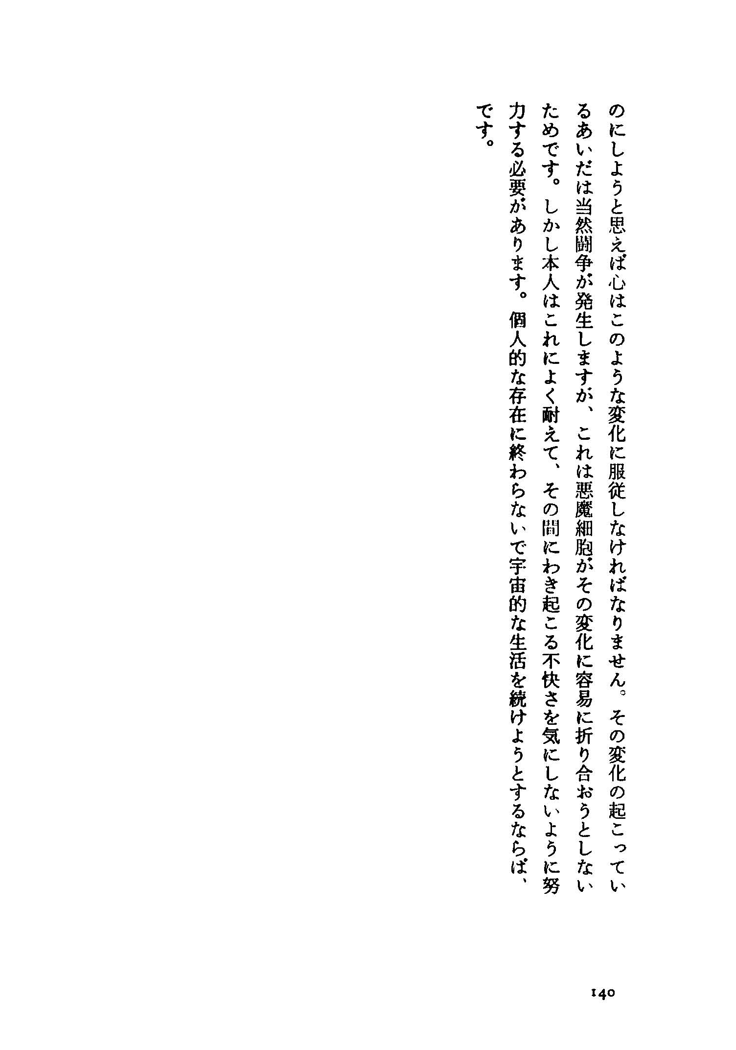 異常な悪魔的細胞を正常な宇宙的な細胞に変えるには、宇宙的細胞の助けをかりて心が化学的な変化を起こさねばなりません。