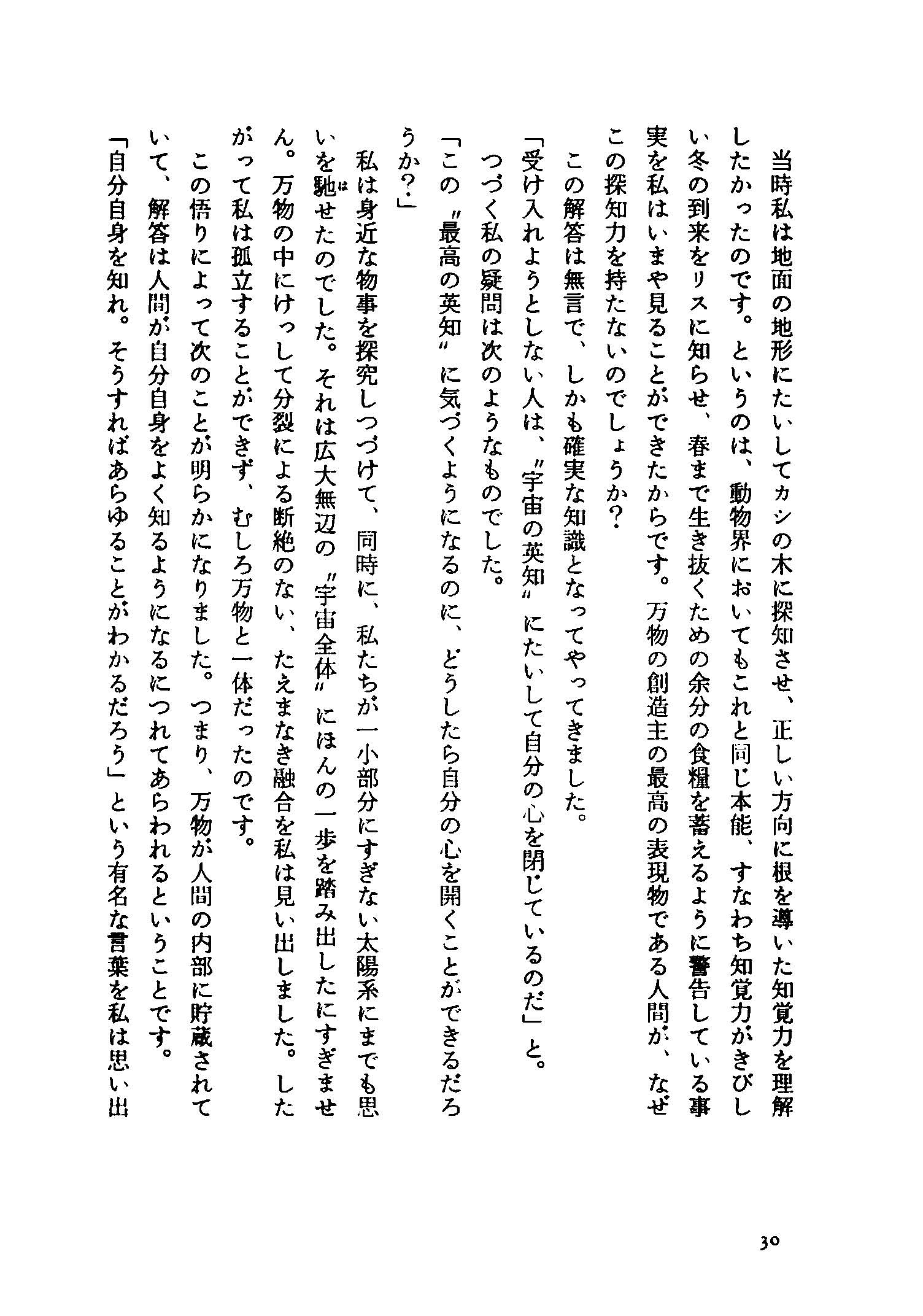 というのは、動物界においてもこれと同じ本能、すなわち知覚力がきびしい冬の到来をリスに知らせ、春まで生き抜くための余分の食糧を蓄えるように警告している事実を私はいまや見ることができたからです。